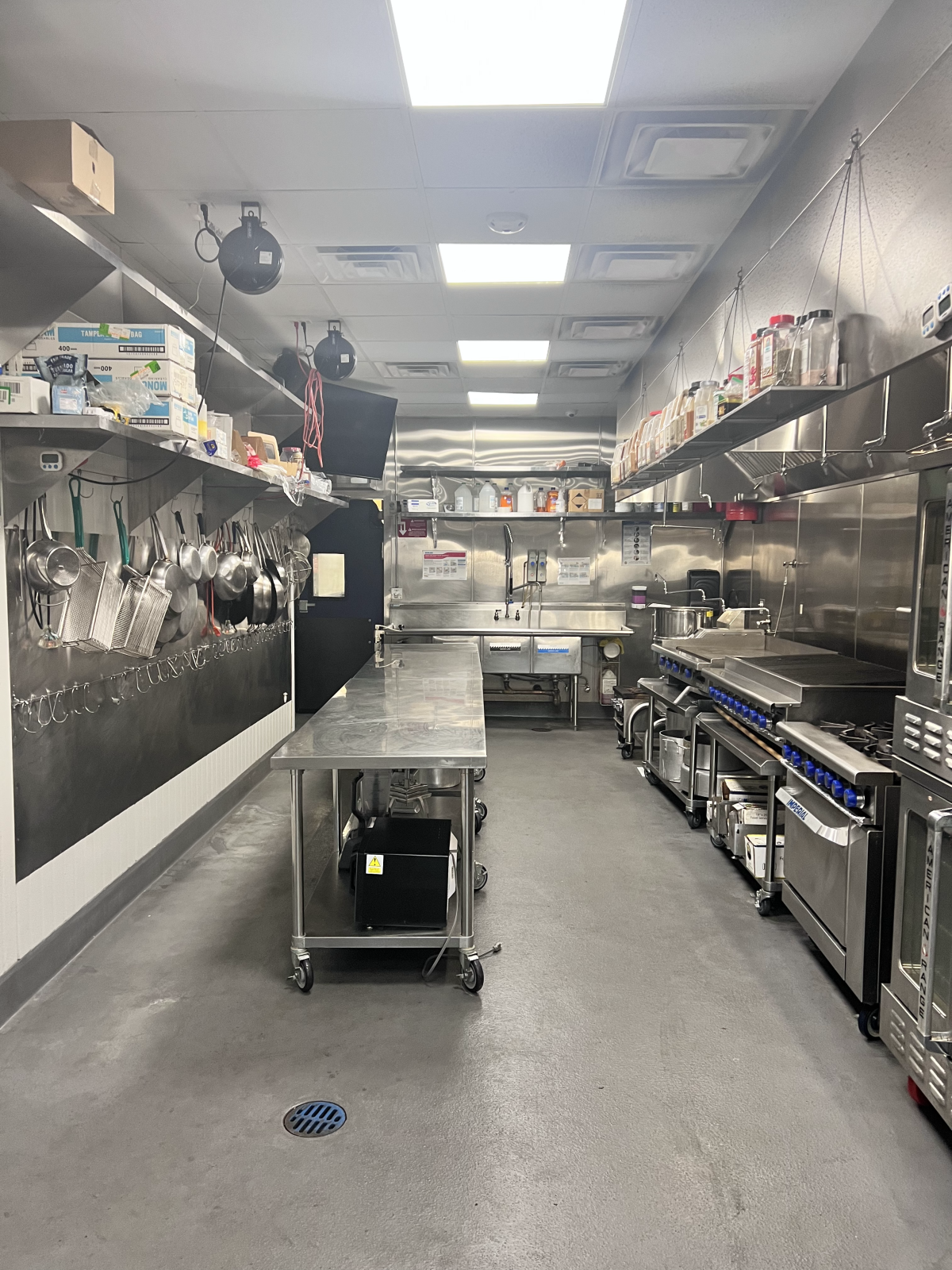 Large open spaced kitchen with parking, wifi and restrooms. Convection ovens, stove tops, flat top grill, open fire grill, 3-sink dishwashing compartment. Plenty of count space with walk-in cooler and shelves for storage. We have plenty of utensils, pots, pans, etc but feel free to bring your own.